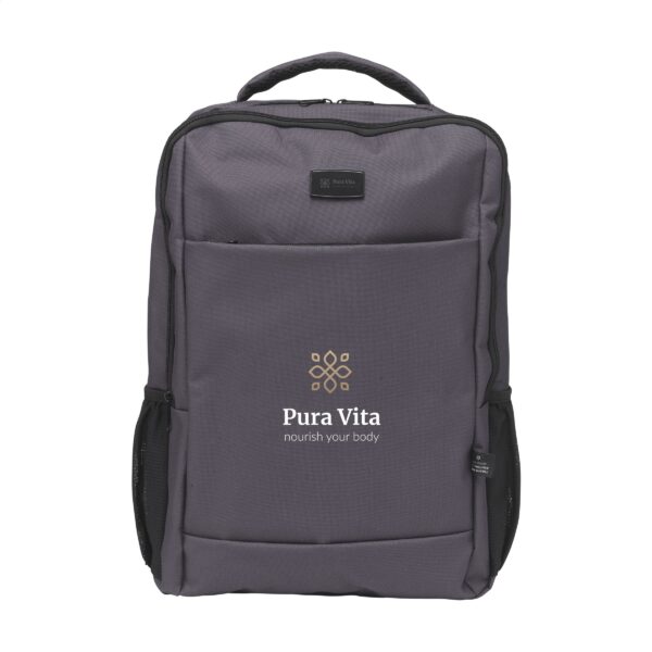Solide rugzak van stevig RPET polyester. Met 2 royale compartimenten. Het eerste vak heeft veel ruimte en diverse insteekvakken voor het overzichtelijk opbergen van accessoires. Het tweede vak heeft een foam beschermvak voor het veilig vervoeren van een laptop tot 15,6 inch. Met extra ritsvak aan de voorzijde en een meshvak aan beide zijdes. De verstelbare schouderriemen, het achterpaneel en de handgreep zijn bekleed met mesh stof en voorzien van foam voor extra draagcomfort. Met extra lus om de rugzak aan een trolley te bevestigen, stevige ritsen, volledig gevoerd en keurig afgewerkt. Een luxe rugzak met vele extra’s. GRS-gecertificeerd. Totaal gerecycled materiaal: 90%. Inhoud ca. 12 liter.